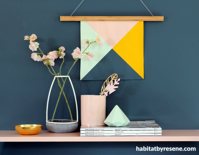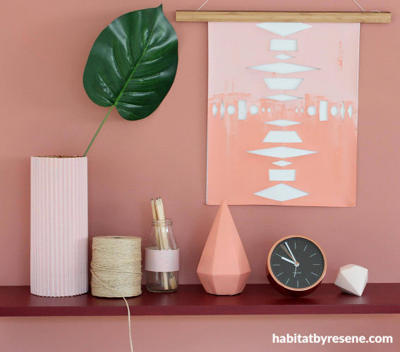Dusky coral is a desirable colour but how to make it work? Keep it simple. Pair with copper tones, muddied reds, and icy pink accents. Nikki’s used Resene Coral Tree for the wall, Resene Persian Red for the shelf, Resene Paper Doll for the vase, milk bottle and artwork and Resene New York Pink for the diamond and artwork backing.