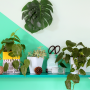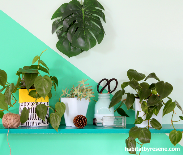 This would look so fresh in a kitchen or bathroom, don’t you think? Strips of Resene Home Run and Resene Half Carefree on the wall and Resene Freefall on the shelf is an inviting palette. It’s the perfect backdrop for hanging plants, herbs and plant cuttings.