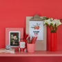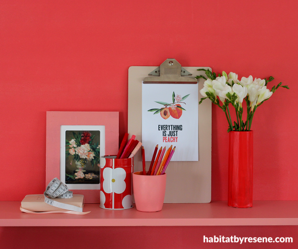 Red is an energetic colour that can be softened by, believe it or not, muted shades of red. This peachy colour combo uses shades of red and well-placed neutrals. Get the look with Resene Rapture on the wall, the shelf and glass (with pencils) in Resene Glorious, the clipboard in Resene Cashmere and the tall vase in Resene Havoc.