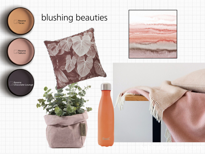 At Collected, owner LeeAnn Yare has a huge range of eclectic wares, but chose this dreamy palette of products based on blush, apricot and copper with touches of plummy black, co-ordinated with Resene Tacao, Resene Sakura and Resene Chocolate Lounge.