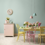 The wall is Resene Nebula, the table and chair at left are Resene Moonbeam, while the other chairs are Resene Princess and Resene Melting Moment. The cabinet is in Resene Pink Terrace and Resene Bianca while the jar vases are in Resene Alluring, Resene Sea Nymph and Resene Pink Lace. The floor is in Resene Colorwood Whitewash and the skirting is in Resene Pink Terrace.