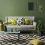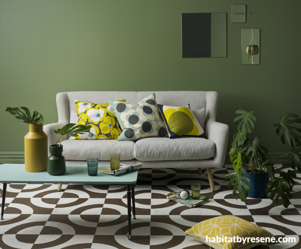 Today we can use those colours in this hippy-inspired living room, with a stunning stencilled floor in Resene Lignite and Resene Quarter Cararra, a wall in Resene Paddock, a table top in Resene Unwind, and vases in Resene Intrepid and Resene Seaweed.