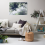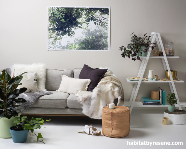 Today this living room has a Scandi vibe, with animal skin rugs and cushions, house plants and a wall in Resene Half Tea. The floor and tree stump are Resene Sea Fog while the pots are Resene Soft Apple (large, on floor), Resene Tax Break (medium, on floor) and Resene Gum Leaf (on shelf and tree stump).