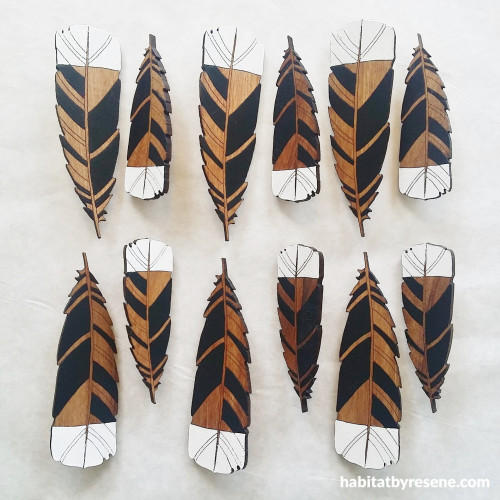 Inspired by the feathers of the Huia bird, these brooches by Natty are made of rimu and painted in Resene White and Resene Black – available to buy here.