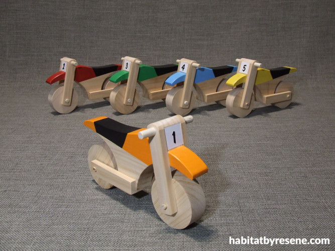 For kids who like things that go ‘vroom’, give them the gift of these Wooden MX bikes, which come in five colours (all from Resene). Custom numbers can be applied on request. Available from All Abuzz here.