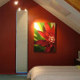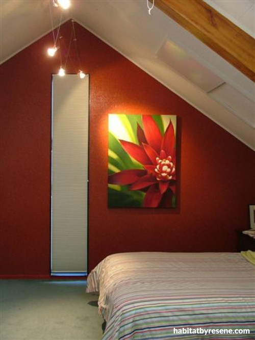 In the main bedroom Malcolm and Tracey selected a burnt red textured wallpaper (Gass VP, from Trove Design in Ponsonby) to strengthen the form of the building and contrast with the green carpet.