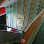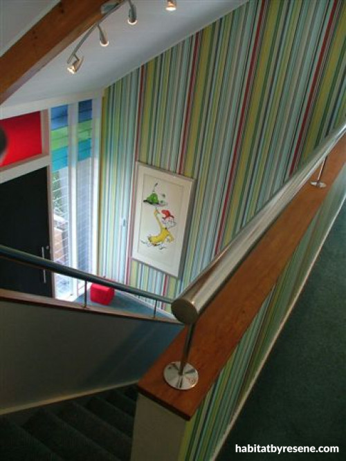 The vertical striped ‘Barcode’ wallpaper (sourced by Danielle Norling at Trove Design) in the foyer reflects the colours of the stained glass windows and emphasises the height of the space. A Dr Seuss print in the atrium is a favourite.