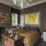 A feature wall in Resene Claret is an elegant and inviting backdrop to this Art Deco themed bedroom. The other walls are in Resene Tana.