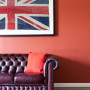 The antiqued oxide tones of Resene Pioneer Red are a great accompaniment to a deep-buttoned leather sofa and framed Union Jack in a home owned by Monica Johns.