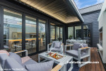 Tim & Arthur’s elegant balcony features an outdoor dining area that is colour coordinated with their exterior weatherboards, fascias and facing boards in Resene CoolColour Element.