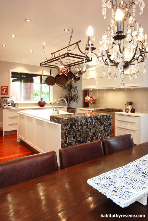 "The key focal point of the kitchen is the natural granite waterfall with its large embedded river stone look," explains interior designer Amanda Neill of Designworx. "It was designed to flow over the side of the bench in a Dali-esque manner, with an organic feel to it. It is highly visible as you enter from the main door, and the play on scale and height adds interest into what would otherwise be a very neutral kitchen."