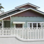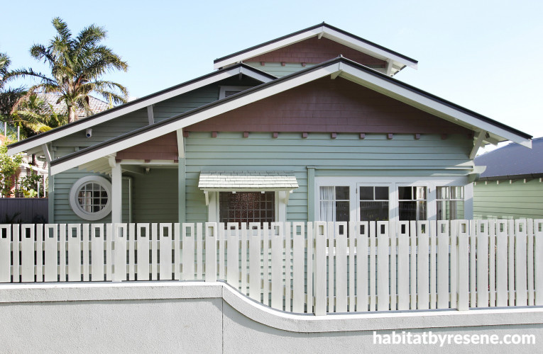A quirky interpretation of a classic picket fence graces the front of this bungalow, as it peeps out from behind. The fence is painted Resene Half Pearl Lusta while the house weatherboards are Resene Bluegrass and the fascia is Resene Copper Rust.