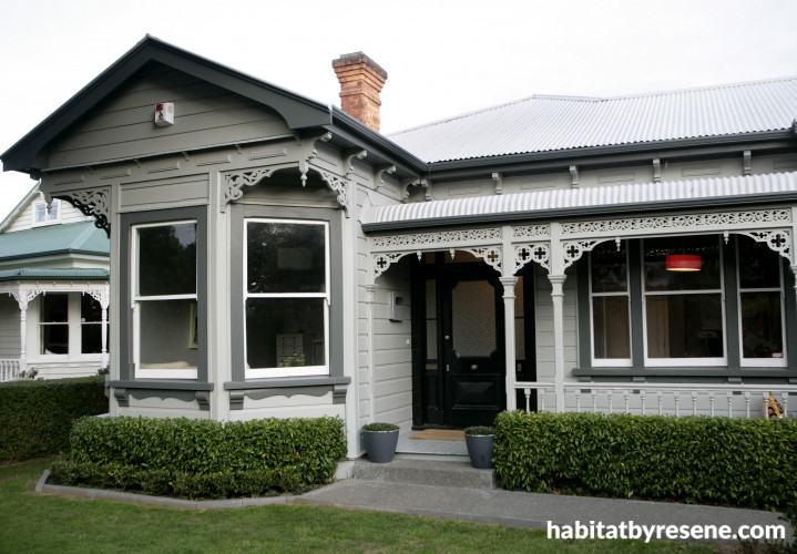 When Jocelyn and Jason Miller bought their pretty farmhouse, it was painted in shades of green and orange. Wanting a more modern look that would make the house stand out from its surroundings rather than blending in, they chose Resene Grey Chateau for the weatherboards with Resene Tuna for the spouting and doors – a good colour to act as a visual break between the brown roof tiles. Unsure of what colour to paint the trims, their painter from Martyns Painting in Gore suggested a white. Resene Barely There “lifted everything and looked great,” says Jocelyn.