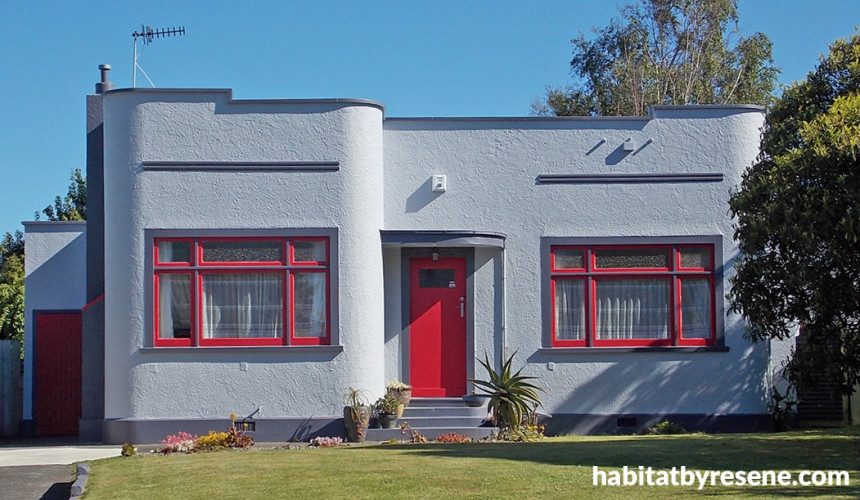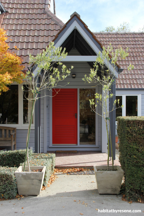 Jocelyn and Jason chose a complete contrast to their soft blue-grey weatherboards for the front door, with the rich red Resene Bullseye.