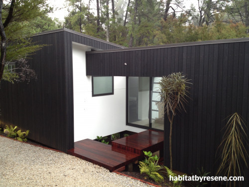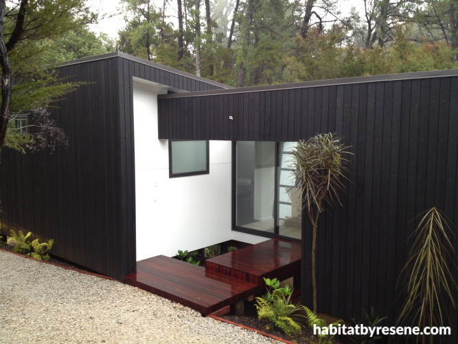 A clean yet contrasting scheme of black and white is perfect for this holiday home designed by Tony Karsten of Karsten Architectural Design in Nelson. He used Resene Pitch Black from the Resene Woodsman stain range for the vertical cedar weatherboards to reflect the black trunks of the kanuka trees on the hills behind the house. This contrasts with Resene Sea Fog (a white with a hint of grey) on the cement fibreboard.