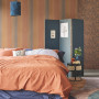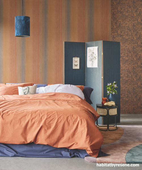 Upon entering this room, you are immediately greeted by an ambiance of creativity and individuality. The walls are adorned with three different styles of wallpaper from the Resene Museum Wallpaper Collection, skilfully combined to create a harmonious yet dynamic atmosphere. This bedroom's design concept revolves around embracing diversity and celebrating the beauty of contrasting elements, which it achieves effortlessly by integrating the muted teals, sun-kissed oranges and rich blues. For complementary paint colours, try Resene Tuscany, Resene Twizel, Resene True Blue or Resene Atomic.