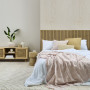 The headboard, made of battens, is a simple yet texturally interesting feature that sits further forward in the room, finished in Resene Colorwood tinted to the shade Resene Bask, a golden hue reminiscent of a warm sunset on the beach. You might notice that everything in this room is textured to some degree, which gives more visual layering – the timber grain, raffia, rug, weathered effect of the vases and the (purposefully) rumpled bedlinen that invites you in.