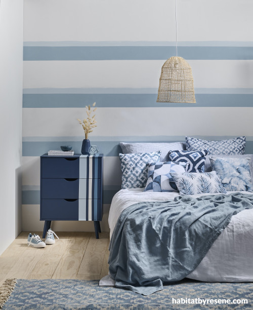 The shades of the seaside will help soothe you into a good night’s sleep. This bedroom’s rear wall is painted in Resene Alabaster with thick hand-painted stripes in Resene Frozen and narrow hand-painted stripes in Resene Quarter Frozen. The flooring is stained in Resene Colorwood Natural and the side table is Resene Kashmir Blue. Project by Vanessa Nouwens, image by Bryce Carleton.