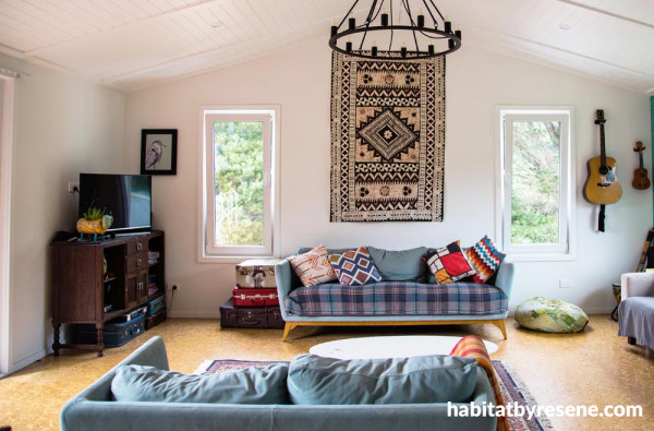 “Our house is filled with pre-loved rugs and furniture sourced over the years from op-shops, friends and family and TradeMe. The cost savings were then invested in higher quality materials to improve the home’s thermal performance, such as insulation and joinery,” Roshan says. Walls in Resene Half Rice Cake and ceiling and skirting boards in Resene Quarter Rice Cake.