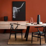 Use an animal artwork as the starting point for a room’s colour palette and theme. This chic dining room has the surprise and delight factor with its clever use of a colour inspired by the print. The Cow in the Dark print from Nood is black and white but links thematically to the Resene Mocha walls, which are the colour of the cattle’s thick coat. The elongated horn shape seen in the print is emulated in the wine decanter, black vase and the smooth curves of the replica wishbone dining chairs, all from Nood.