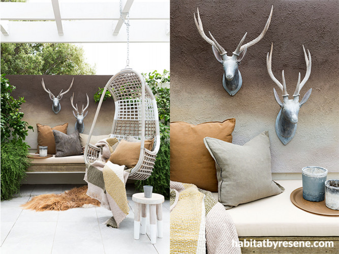This Resene Resitex and Resene Sandtex textured wall is painted in an ombre effect in Resene Sambuca, Resene Papier Mache and Resene Martini. The hanging egg chair is stained in Resene Woodsman Bleached Riverstone and painted with Resene Alabaster stripes and hangs from the pergola which is painted in Resene Rice Cake. The stool is Resene Whitewash with Resene Alabaster legs. The deer heads are finished in Resene Whitewash.