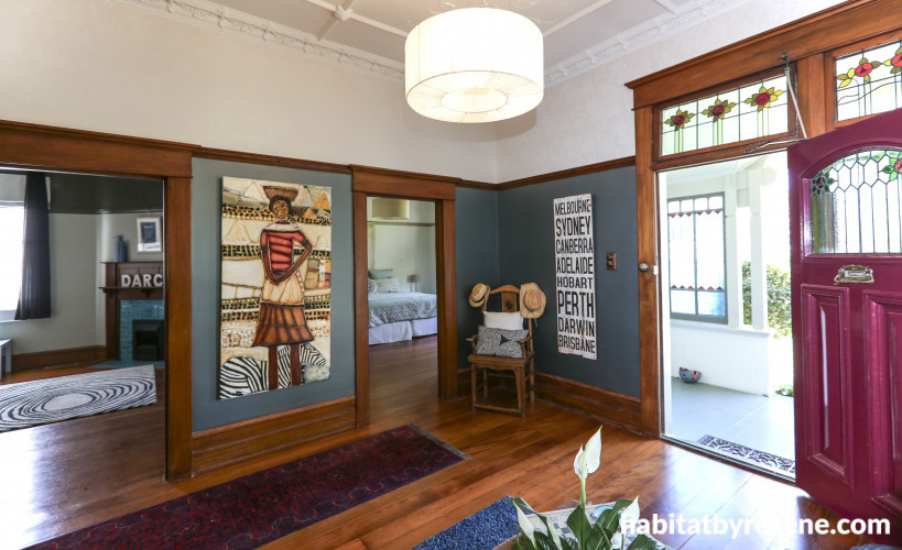 Resene Innuendo in the hallway provides moody warmth as you are led to the sunnier side of the home.