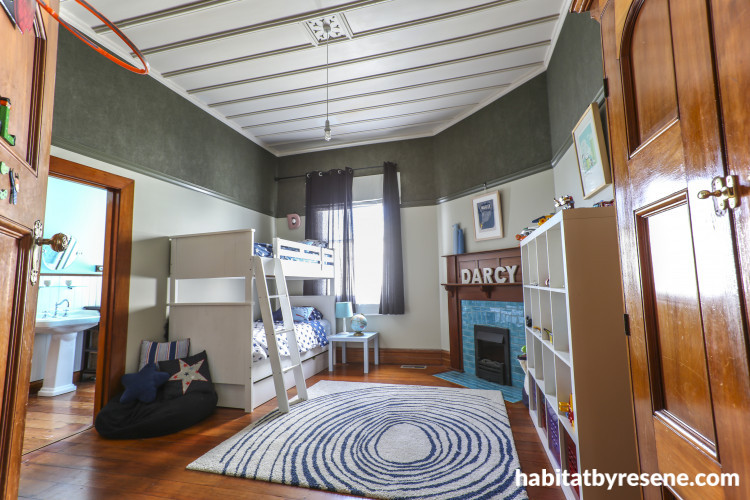The couple broke tradition by using wallpaper above the picture rail and softer colours in the larger wall space below. Connor’s room uses Chacran 46015 wallpaper (from Resene), with Resene Raptor on the picture rail and Resene Linen on the lower part of the wall.