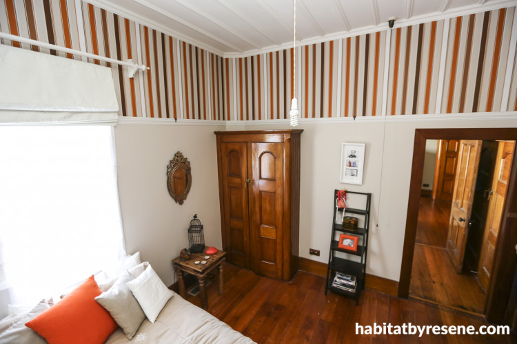 Noah’s bedroom is Lisa’s favourite because of its punchy modern feel. The bold orange striped wallpaper from The Flex Flash Funky range from Resene complements the tones of the rimu flooring. The lower walls are in Resene Half Sandspit Brown.