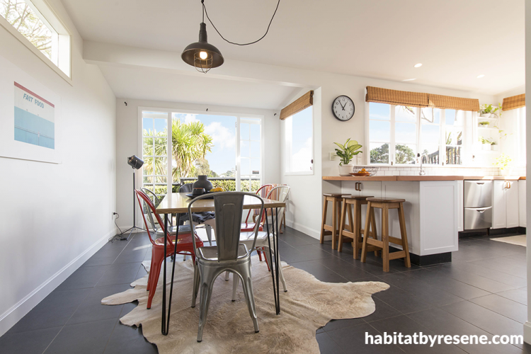 The open-plan dining room and kitchen are painted in Resene Black White and look over stunning views of the Waitakere Ranges.
