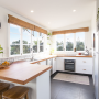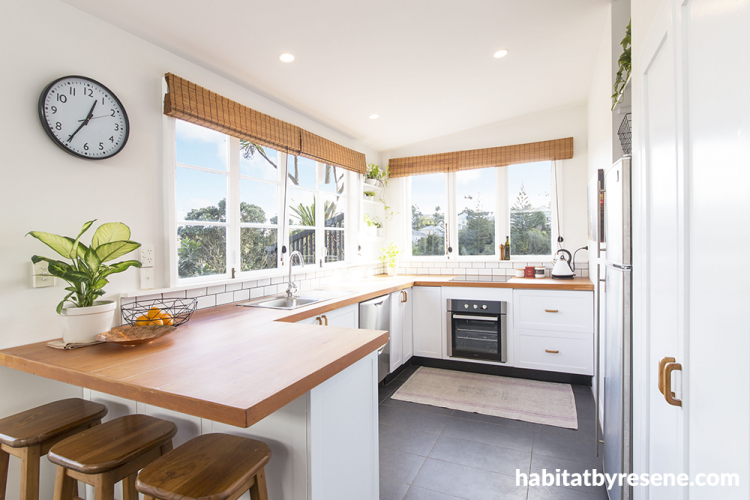 The dining and kitchen rooms have elevated views to the Waitakere Ranges with some stunning sunsets, so they kept the space simple also in Resene Black White. The timber benchtop adds warmth in the Scandi-inspired kitchen.