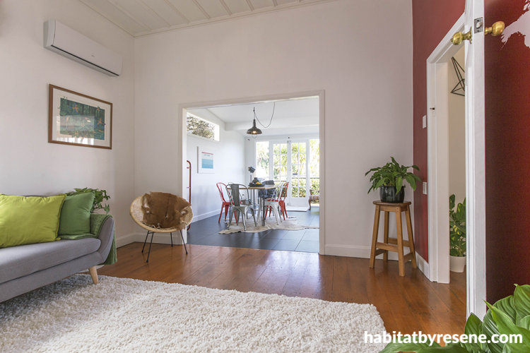 And instead of erasing the red walls in the living room, which were “a bit full on”, the couple painted three walls and the exposed brick fireplace in Resene Black White for a more modern look. The one red wall ended up being a bit of a feature wall that gives the room character.