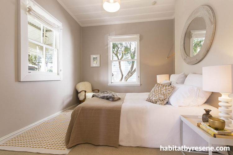 Resene Serene was used in the two front bedrooms to create a modern yet neutral background so that the artwork and accessories can shine. The character high ceilings create a lot of volume and the rooms can handle darker tones.