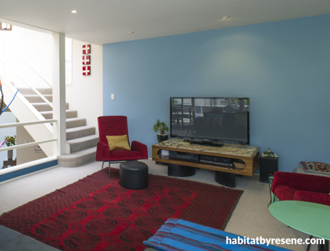 Bright and energetic Resene Daredevil is also used in the boldly themed games room, where the teenage sons have full run.