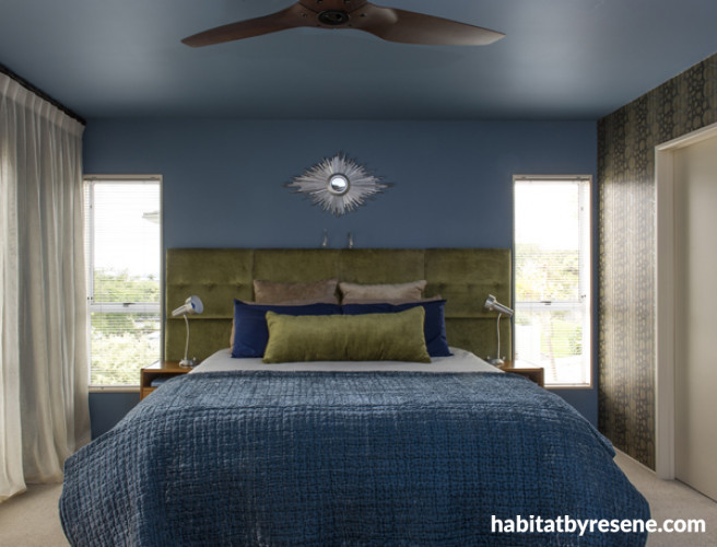 A tranquil combination of blues and greens in the main bedroom are in keeping with other blues used in the house. Ceiling and bedhead wall painted in Resene Seachange.