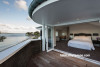 I think my favourite part of the house is the entrance. When you walk in, you see this graceful grand sweeping staircase with beautiful light streaming in. It is part of the west side of the house, so beautiful golden light spills in all afternoon. Then you travel up curved stairs and immediately are hit with this massive expanse of glass that takes your eye out to the ocean beyond. It really worked beautifully.