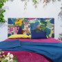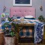 Garden Party is an exuberant abstract floral design with a painterly feel. Made from English linen, each headboard will be unique depending on the cut of fabric. The headboard is shown against a wall in Resene Rolling Fog.