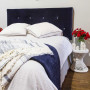 Rich navy velvet is complemented with white piping and buttons with china plate motifs, creating a strong yet whimsical headboard design called Family China. The headboard is shown against a wall in Resene Duck Egg Blue.