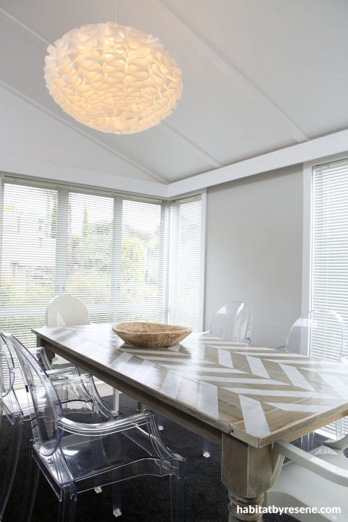 The large dining room looked empty no matter how much furniture they added, so Jessica decided to break up the expansive walls by adding a dado rail and painting the walls beneath it Resene Bokara Grey. Says Jessica: “It really anchors the room while giving it some life.”