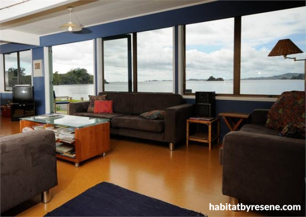 The large lounge features 180-degree views of the bay and is painted in Resene True Blue with ceiling and trim in Resene Black White.