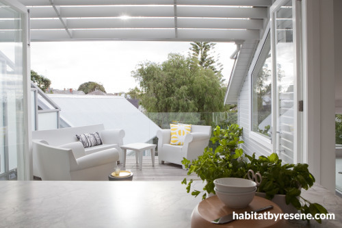 The deck, stained with Resene wood stain, has been turned into a second living area with stylish outdoor furniture from Kartell.