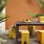 Bring a piece of Pacifica to your backyard using those new fiery shades in a setting like this one, with Resene Rumour Has It on the walls, Resene Aloha, Resene Malarkey and Resene Celebrate on the peg stools, and Resene Sambuca on the table. The 'deck mat' is made of pine planks stained in Resene Woodsman Banjul.