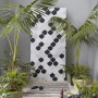 We handpainted our shower wall in hard-wearing Resene Lumbersider low sheen paint, using Resene All Black, Resene Quarter Delta, Resene Quarter Truffle and Resene Double Alabaster. The understated courtyard setting is painted in Resene Delta.