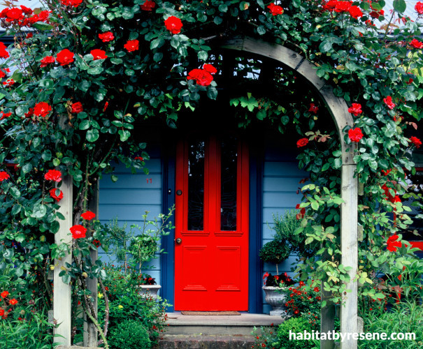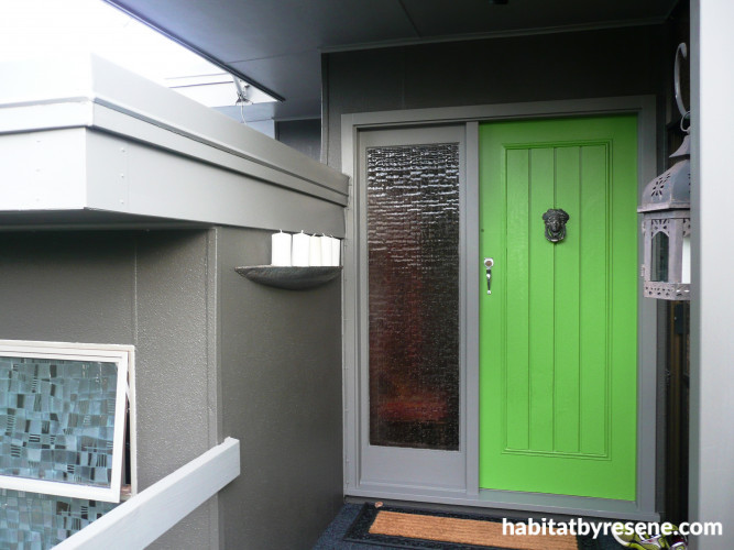 There are all sorts of tricks to make your entrance more obvious but one of the easiest ways to herald a front door is to paint it in a nice bold Resene paint. Red is a perennial favourite but glossy black has also been seen on many a smart front door – that whole crisp white villa with clipped hedges and a black front door look, just like this one with a Resene Nero front door which is fitted with a clever Dora Doors screen. Limey green and orange have also been seen peeking out from the fronts of houses with regularity lately.