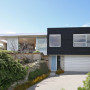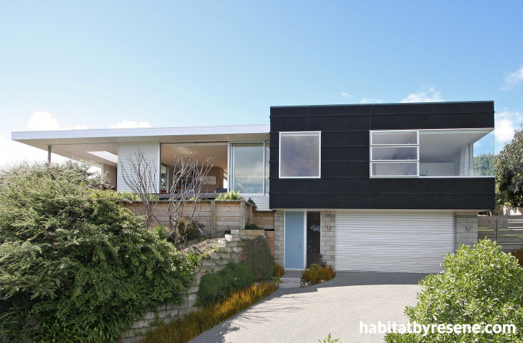 This home by Space Architecture has an icy blue front door in Resene Tsunami that stands out from the Resene Pitch Black exterior stain and corrugated cladding which is Colorsteel Maxx, colour Foam. The soffits are Resene Alabaster.
