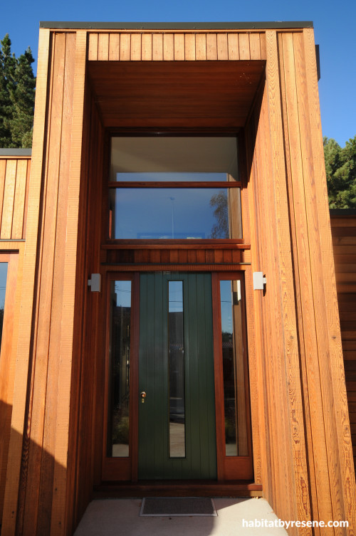 A dramatic almost double-height entrance is made even more visually uplifting with vertical timber board and a door in Resene Deep Khaki. It’s in a home designed by John Ayers of Creative Studios.