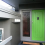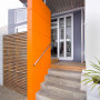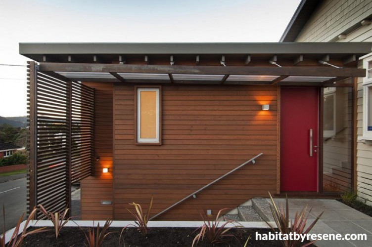 The front door may not be a bold colour but the fin wall certainly is – making it very obvious where you need to go to get to this retrofit of an old butcher’s shop in New Plymouth, designed by architect Ian Pritchard. The orange is Resene Mexican Wave while the grey wall in the background is Resene Tuna.