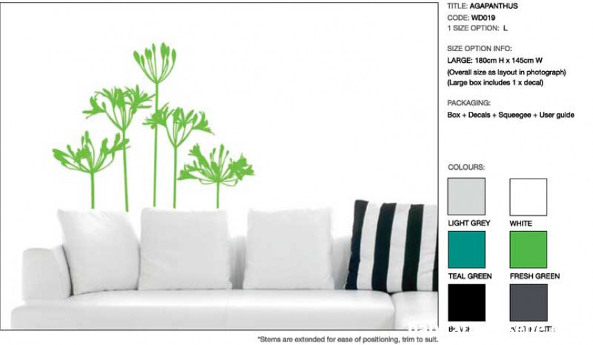 If you don’t want a full green wall but want a bit of botanics in your life, these cool agapanthus wall decals are from Resene (they come in six colours). Click here for more designs.