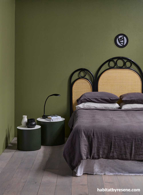In this Art Deco-inspired bedroom the walls are in Resene Finch. Floor in Resene Colorwood Mid Greywash, drum tables in Resene Black Forest (sides) and Resene Green White (tops). Plant pots and vases in Resene Nero and Resene Olive Green. Paris Headboard in Black/Natural from The Cane Collective, duvet cover in Pepper, Sove Linen pillowcases in pepper and pinstripe, striped linen throw from Città, black LED touch lamp from Lighting Direct. Project: Laura Lynn Johnston, image: Bryce Carleton