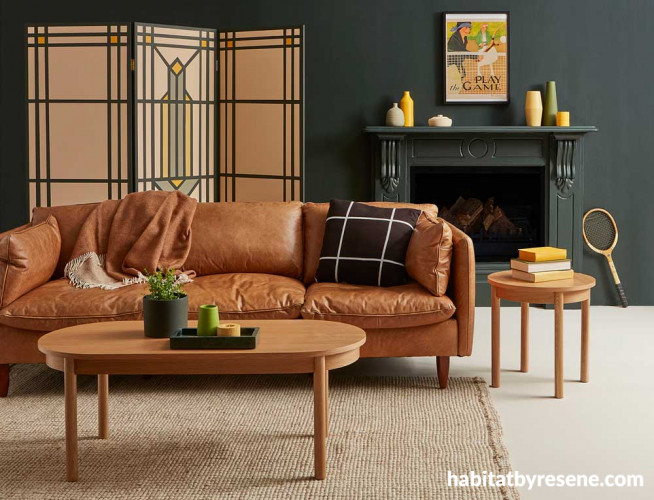 Using the colours of the forest in this lounge, the wall and fireplace are both in Resene Midnight Moss. Floor in Resene Half Fossil, door in Resene Leather, folding screen in Resene Tequila with ‘leading’ in Resene Midnight Moss and coloured ‘stained glass’ in Resene Bandicoot,Resene Rob Roy and Resene Lightning Yellow. Plant pot in Resene Black Forest, vases in Resene Leather, Resene Rob Roy,Resene Clover, Resene Sushi, Resene Lightning Yellow and Resene Bandicoot, painted books in Resene Lightning Yellow,Resene Clover and Resene Rob Roy and coaster in Resene Half Fossil.Sofa, rug, side table and coffee table from Freedom, throw from Città, mug by Fiona MacKay from Public Record, ‘Play the Game’ tennis poster from Pictorem, marble tray and grid cushion from H&M Home. Project by Laura Lynn Johnston,image by Wendy Fenwick.