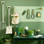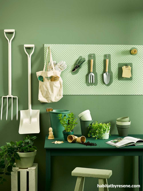 A potting shed with pizzazz! Walls and floors in Resene Rivergum, table in Resene Palm Green,stool in Resene Bud and pegboard in Resene Nourish with tool outline in Resene Rivergum. Pots painted in Resene Nourish,Resene Bud,Resene Palm Green, Resene Rivergum, Resene Secrets, Resene Peace, Resene Middle Earth, Resene Paddock, Resene Mangrove and Resene Spanish Green and crates painted in Resene Rice Cake. Tools and growing kit, gloves, string, fork and trowel, seed packets, biodegradable pots all from Bed Bath & Beyond, spade and fork from The Warehouse, bag from The Aromatherapy Company. Project by Vanessa Nouwens, image by Bryce Carleton.